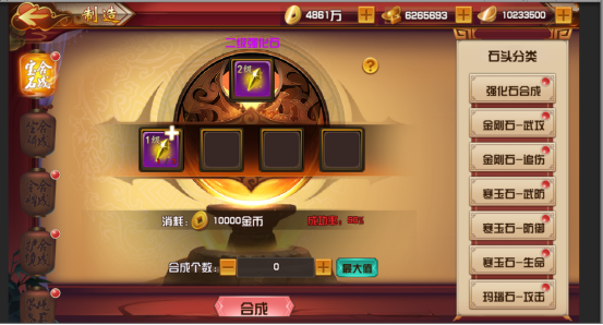 (3)界面左侧下部显示玩家合成宝石,需要消耗的材料以及合成的成功率。