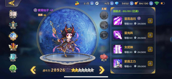 2、紫霞:16资质的神将,能打能抗,我用来当做福坦了,队伍的最高输出,经常一个大招干死对面前排(紫霞开大的时候对面前排基本半血左右),一定要有水属性,不然打人不疼。紫霞二技能是核心技能,控制对面智力武将,一般智力武将都是输出和奶,基本第一个控制完可以连上第二个,好几秒不能动,很好的控制对面输出。三技能紫霞的神技,时间越长攻击越高,观察了好几次,孙坚打对面700血的时间,紫霞一个平A要在2100左右了,非常强劲。紫霞4技能比较平常和孙坚一样加物理防御,增加生存时间,打出更高输出。