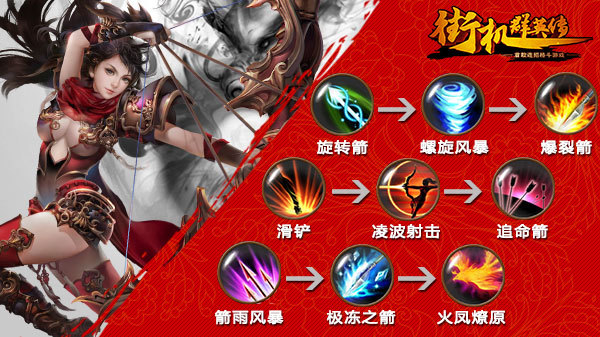 “爆裂箭”:跳在空中射出箭,箭碰到地面就会爆炸,并且对一定范围造成大量伤害。