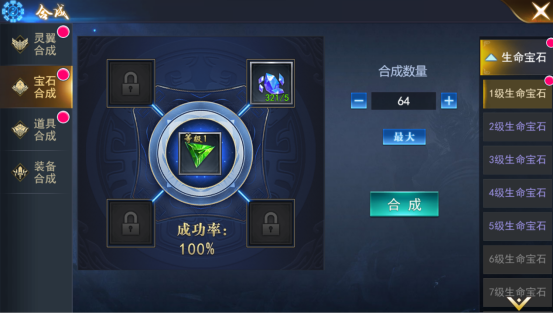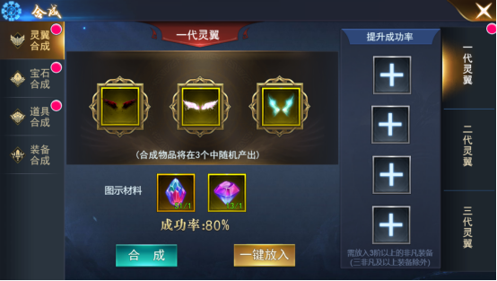 合成同样是游戏中较为重要的一个玩法,在合成系统中分为了四类,分别是灵翼的合成,宝石的合成,道具的合成以及装备合成。