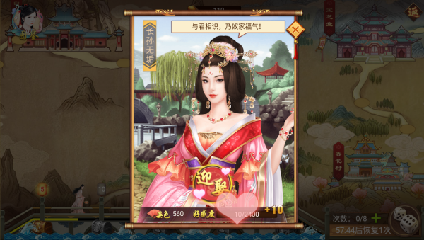 寻访 寻访类似大富翁玩法,玩家每天可投掷8次骰子在地图上进行移动,移动后会触发随机事件,如获得道具或遇到美人。 撩美人可增加好感度,当好感度满后可迎娶美人。投掷骰子达到指定次数还能获得宝..