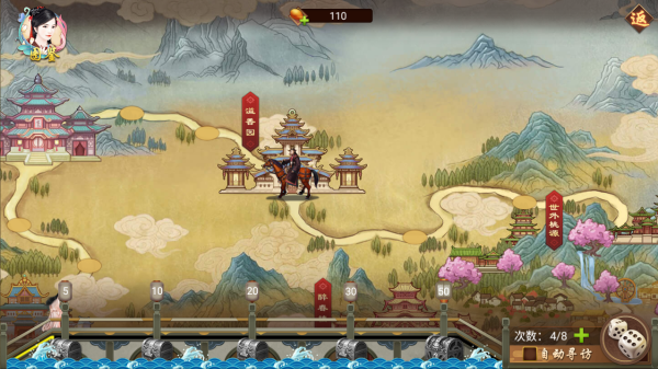 寻访类似大富翁玩法,玩家每天可投掷8次骰子在地图上进行移动,移动后会触发随机事件,如获得道具或遇到美人。