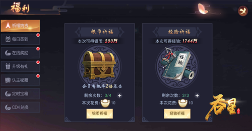 另外一种最直接获取银币的方法就是祈福,只需花费较少的元宝,就可以兑换相当丰厚的一笔钱财,对于急需用银币提升装备、升级技能的玩家来说,绝对是值得一用的“救火”系统。
