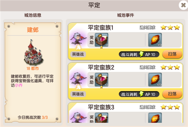 收复建邺后解锁,每次挑战消耗10点AP,通关奖励宝物强化箱和熔炼石,3星通关后可以开启扫荡功能,每日挑战次数为3次,消耗钻石可增加次数,最多增加5次