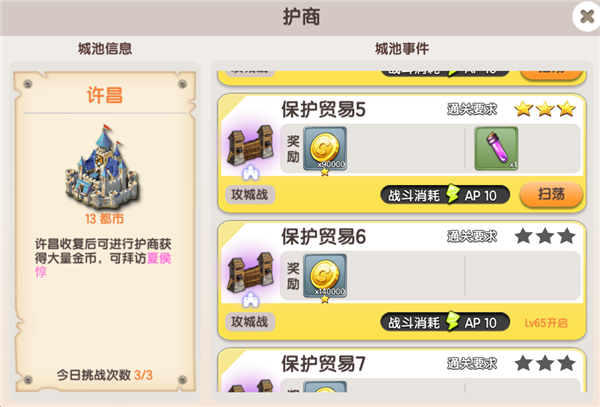 收复许昌后解锁,每次挑战消耗10点AP,通关奖励金币和恢复药剂,3星通关后可以开启扫荡功能,每日挑战次数为3次,消耗钻石可增加次数,最多增加5次