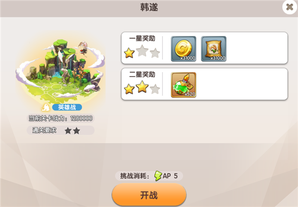 可以看到,每个城池分为五个关卡,每次挑战关卡消耗5点AP,玩家需要达成每个关卡的通关星数要求,才能开启下个关卡,全部关卡通关后,就可以收复这个城池