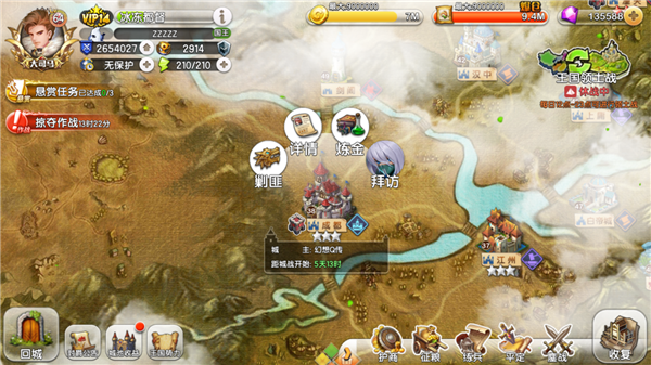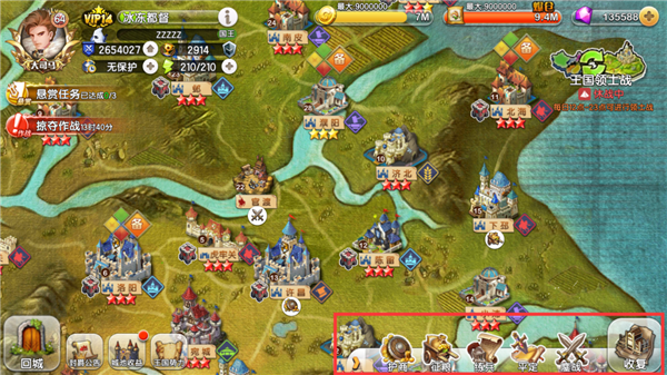 进入征战地图后,就会看到许多城池,这些城池是需要玩家逐个收复的,这也是游戏的主要流程。可以看到,在图中的右下方就是征战系统的各个玩法,那这边就来一一介绍一下