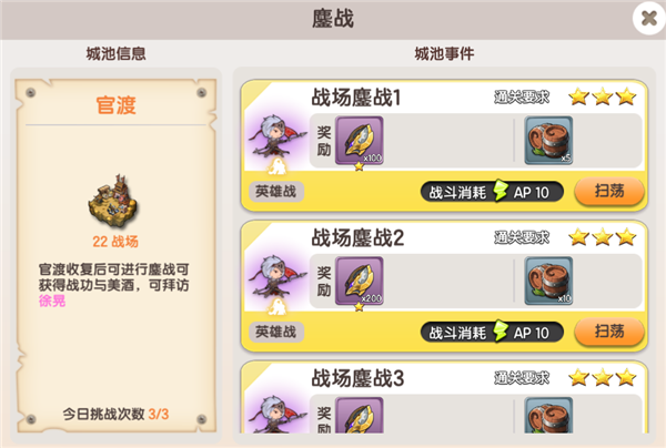 收复官渡后解锁,每次挑战消耗10点AP,通关奖励战功和美酒,3星通关后可以开启扫荡功能,每日挑战次数为3次,消耗钻石可增加次数,最多增加5次