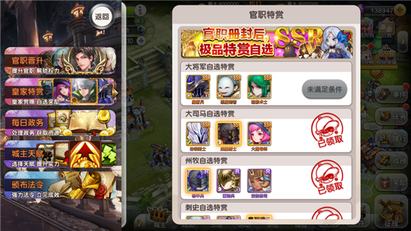 官职晋升界面内容非常详细,晋升要求达到的条件、晋升之后所得到的的奖励和特权、都有一一标注清楚,越高的官职晋升的所要满足的条件越难,因而所得的奖励和特权也更加丰厚。