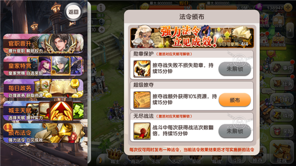 官职督军可解锁城主法令。法令包括勋章保护、超级掠夺等。解锁法令需要激活对应天赋的喔,每次仅可同时发布一种法令,当前法令效果结束后才可实施新的法令。官职晋升后每日可颁布的法令次数也会增加哦。