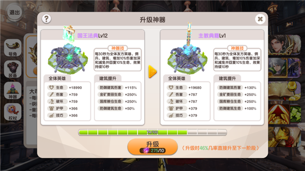 当神器升级时,有几率直接进化到下一阶段,每到达一个新阶段,神器讲提升神器技能的效果,神器技能将在攻城战防守时自动进行施救。