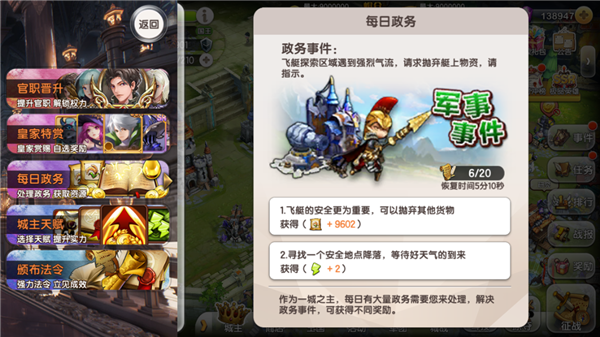 作为一城之主,每日有大量的政务需要您来处理,解决政务事件,可获得不同奖励。