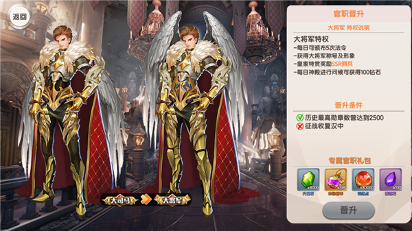 官职晋升是由军曹晋升到大将军的过程,晋升的过程中奖励和特权都会逐渐增加,人物形象也会更加丰满。