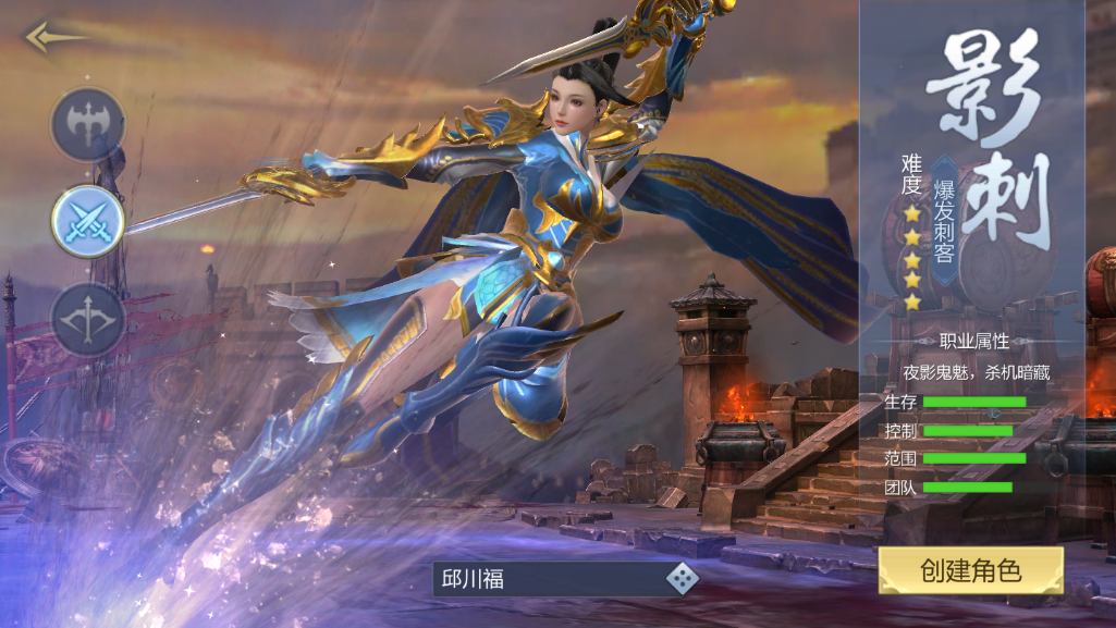 影刺是一名近战刺客型角色,高攻高闪。鹤军善于隐蔽自己的锋芒,运用身体灵活的优点,依靠连击点的爆发给予对方致命一击。