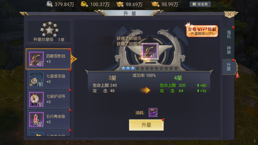 除了等级与阶段,装备还有星级属性,每件装备皆有12颗星的总星级,每提升一次星级,装备技能获得一定的属性加成,从而间接提升人物的战斗力,不过值得注意的是,升星是有一定的成功率的。