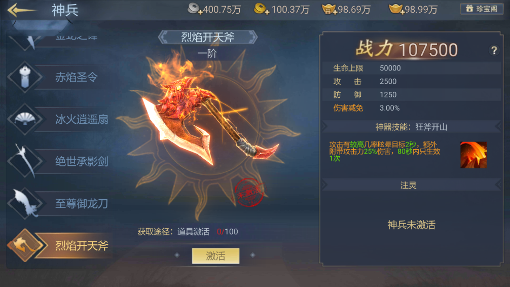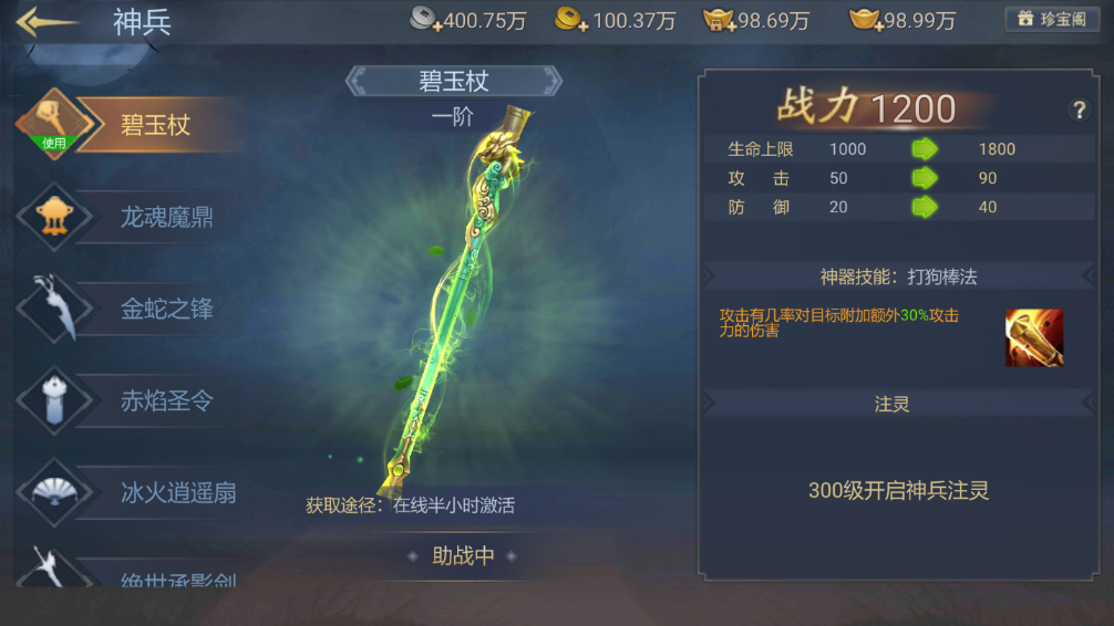 神兵不仅有属性加成,更能获得额外战斗技能,如游戏中最早获得的第一件神器:碧玉仗,其技能大狗棍法可以对目标造成额外伤害;而烈焰开天斧的技能可以让攻击有几率是目标攻击力降低,暴击降低且减速一段时间,同时还能额外增加自己的普攻伤害。
