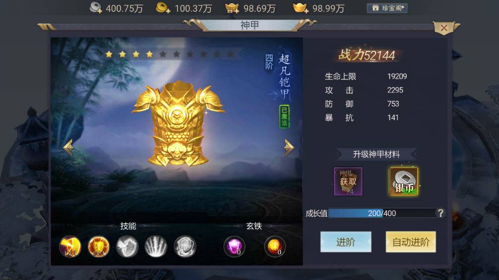 神甲技能同样十分强力,如神甲防御可以让防御提升6%,并且神甲技能还可以通过技能书进行升级,让技能更加强力。