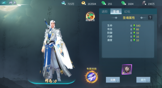 神兵进阶至七阶时,可以开启神兵圣魂系统,圣魂具有专属技能,攻击圣魂值比自己低的玩家时,有概率触发圣魂专属技能,可使用圣魂石进行提升,圣魂石可通过消耗进阶丹兑换或在商城内购买。
