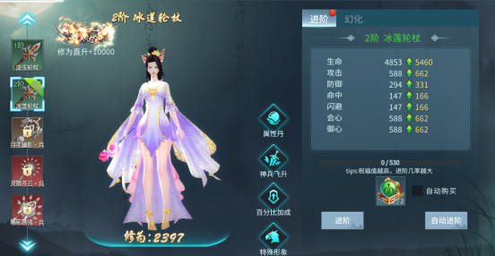 通过神兵进阶丹对神兵进行进阶,提升神兵整体属性(生命、攻击、防御、命中、闪避、会心、御心),进阶丹的获取途径(仙坊、武境、生死之境)。神兵进阶达到10阶、可获得“神兵达人”永久称号。