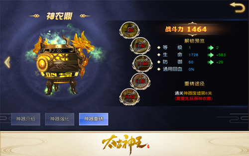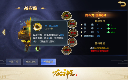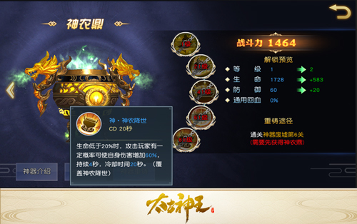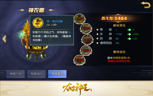 神农鼎完成重铸后五大技能都将得到强化,全面提升玩家在野外续航、副本战斗、PVP各方面的能力。虽然前身是上古大神的药鼎,游戏中神农鼎却属于功能多样的万金油神器。初始的“神·神农回春”属于永续型技能,激活后每10秒为玩家回复一次血量,而且最大生命值6%的效果十分可观,算好时间进入战斗往往能收获奇效。