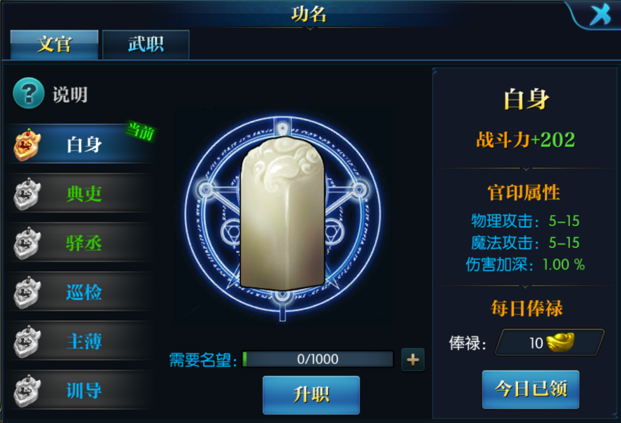 功名分为文官和武职两种,每位玩家在文官和武职两条道路都可获得相应官职,获得官职的玩家每天可以获得俸禄,值得注意的是,文官的每日俸禄是金元宝,武职的每日俸禄是银元宝,当玩家官阶越高,所获得元宝越多,元宝在龙回三国中是非常重要的,所以玩家每天一定不要错过这次领俸禄的机会,当官阶很高后,会是一笔不小财富。最最重要的是,功名官阶的提升还能带来属性的提升,大大提升战力,所以你不努力提升官阶的话就吃亏了。