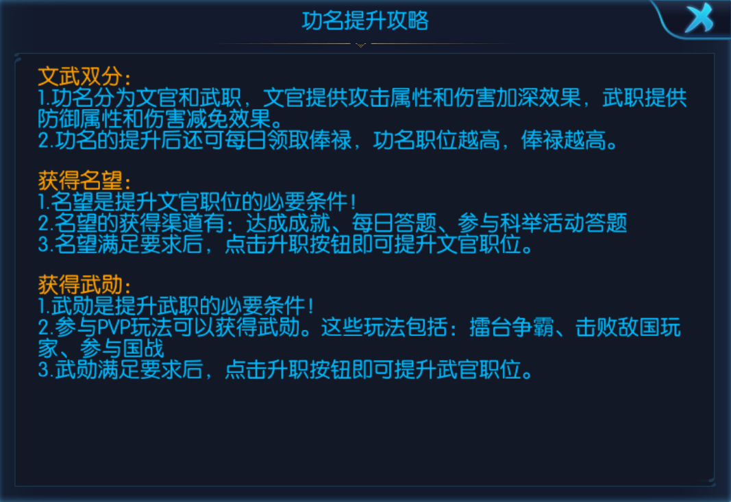 想要提升功名,获得更高的官阶,就需要玩家获取名望和武勋,名望和武勋达到要求的数量,就能获得更高的官阶了,名望的获取需要玩家达成成就,参与每日答题、科举活动等,武勋的获取则需要玩家参与PVP,包括擂台争霸,击败敌国玩家,参加国战等。