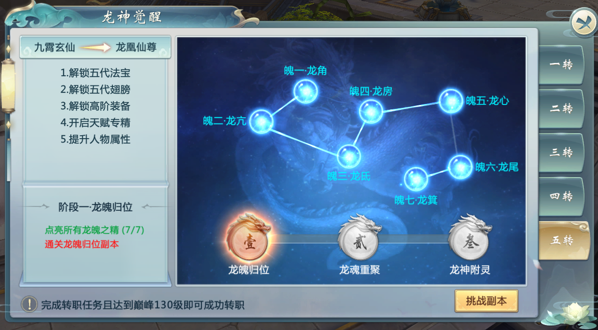 九霄玄仙达到巅峰120级后,便会开启五转任务。经历龙魄归位、龙魂重塑、苍龙觉醒三个阶段,且达到巅峰130级后即可成功转职。消耗经验值或者对应转职道具可以点亮相应精魄,获得大量属性加成。完成五转周期较长,上仙们可以在商城购买转职道具,缩短完成五转的时间。