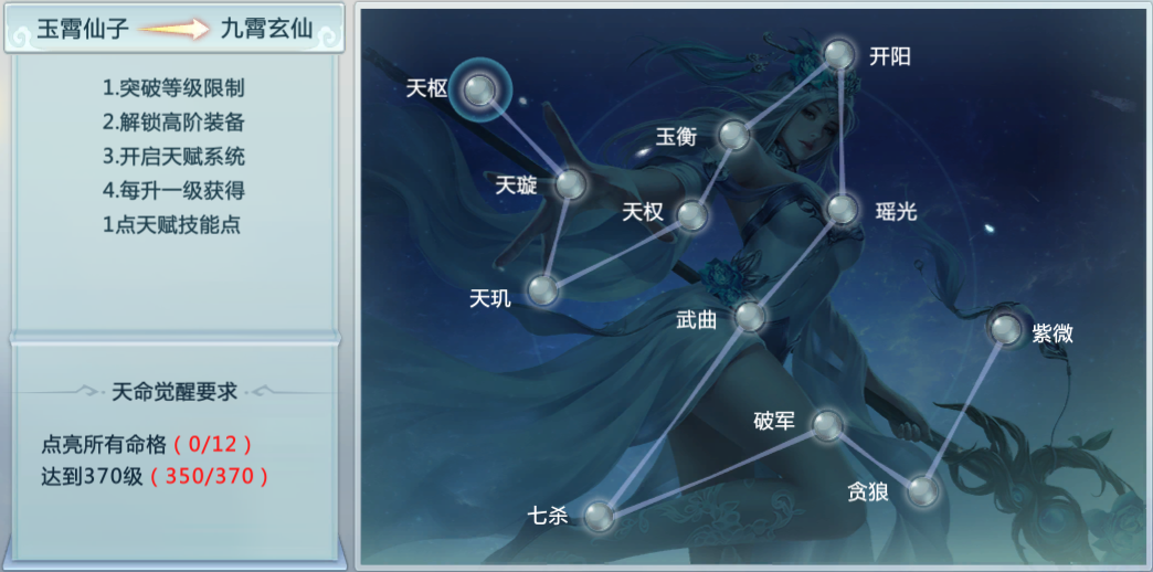 玉霄仙子达到350级后,便会开启四转任务。点亮所有12个命格,并达到370级后即可成功转职。消耗经验值或者天命魂石可以点亮命格,获得大量属性加成。完成四转需要大量时间获取经验值以及收集天命魂石,转职周期较长,上仙们可以在商城购买天命魂石,缩短完成四转的时间。