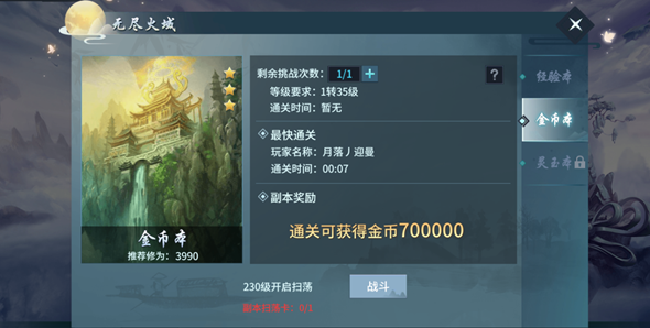 在游戏内的其它日常副本(如登天路、华山论道)等地方也会产出金币,多靠修行者们多多修炼!