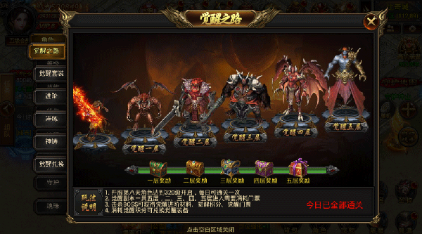 道友们在开服第八天等级到达320级即可开启觉醒之路,每日可以开通关一次,觉醒之路一共分5层,每层的进入都需要门票。