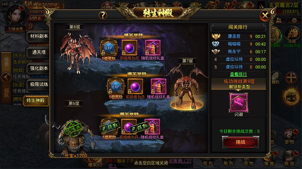 进入转生神殿后通关即可进入下一层,通关能够获得大量的战纹、初级修为丹以及随机战纹礼盒,层数越高,获得的奖励越丰富。