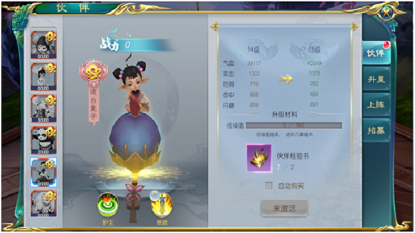 “道台童子”其被动技能是为玩家增加血量、攻击、防御三大属性,主动技能“道台护主”对单个敌人造成伤害,血量越低伤害越高,技能随着伙伴的等级而提升伤害与属性。