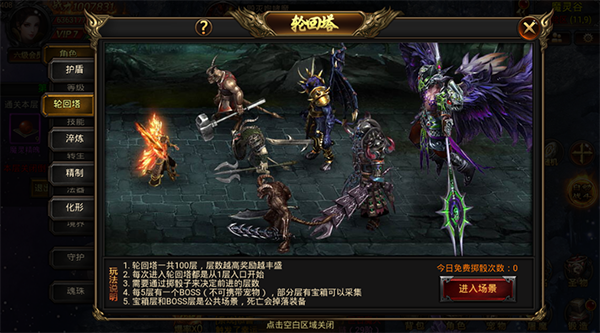 每次进入轮回塔都是从1层入口进入,通过摇骰子来决定你要进入的层数,每天可以免费进入5次。