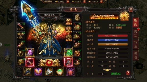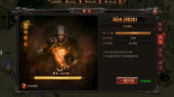 可查看角色信息、爵位等级、转生等级、内功等级等信息。