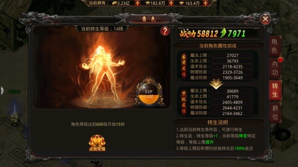 可查看角色信息、爵位等级、转生等级、内功等级等信息。 内功系统可查看内功等级和内功属性,并附有内功说明。 转生系统可查看转生等级和转生后升级属性。 爵位系统可查看爵位等级..