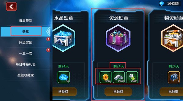 第一,是我们必买的勋章,这里每天可以领取到的物资是性价比最高的一个勋章,每天可以获取到各2.5W的资源;(图-1)