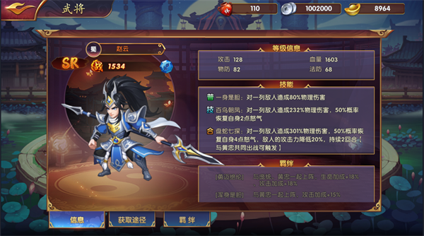 【简评】赵云,蜀汉威名赫赫的蜀国常胜将军“”,合击技能盘蛇七探,对一列敌人造成301%物理伤害,50%概率恢复自身4点怒气,敌人的攻击力降低20%,实属是战场上的好帮手。