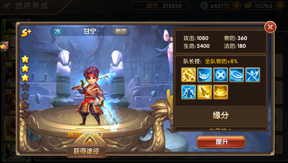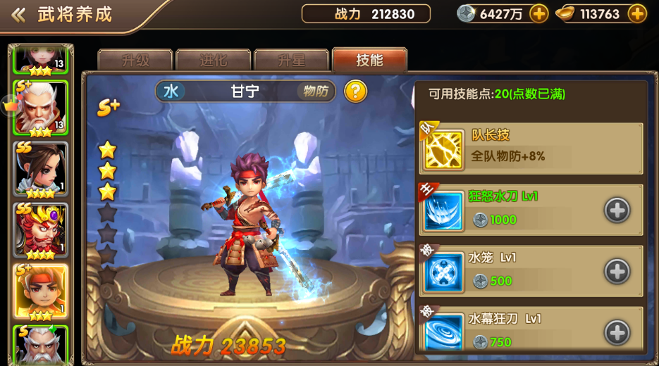 确定了优先培育的武将后,玩家即可利用技能点数来提升等级,持续强化战斗力。每名武将皆拥有一个队长技、一个主动技和海量的被动技能,其中主、被动技能均可强化,最大不超过人物等级哟!