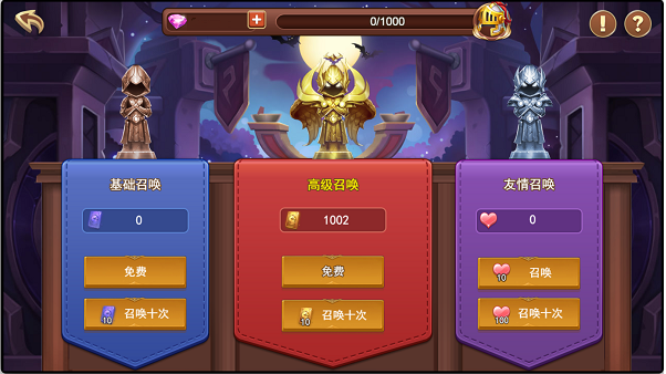 召唤法阵:在这里你可以通过消耗召唤卡,来获得强大的英雄,相信你的运气,成为欧皇不是梦想。