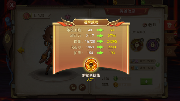 英雄进阶:当英雄达到一定等级后,可以给英雄进阶,进阶提升英雄的属性并且让英雄的技能变得更强。