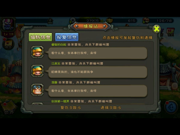 情报站是报告世界争霸的数据,分为两面城防信息、复仇信息!
