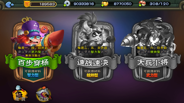 周二、周五、周日开启速战速决通过副本难度可以获得很多统帅型武将提升装备的材料。