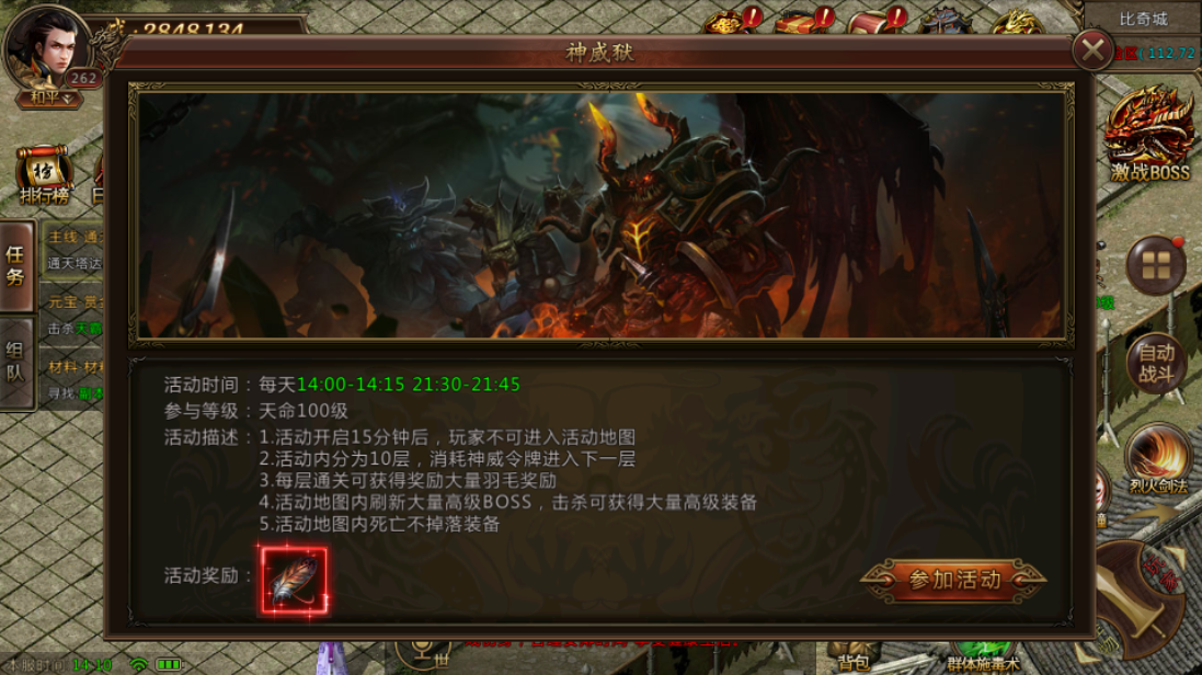 等级要达到天命100级的玩家才能参与神威狱;活动时间是每天14:00-14:15 晚上21:30-21.45,只有15分钟时间哦,所以大家要先及时收集好‘’神威狱令牌‘’,击败每一层的高级boss,击杀后还可以获得大量高级装备,活动内若是出现有玩家争夺boss,打架也是杠杠的!在神威狱活动地图内死亡是不会掉落装备的哦,每一层通关都可以获得大量羽毛奖励。