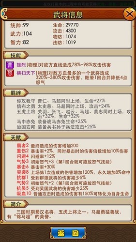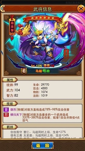 统帅99,武力104,智力79。相比紫将期的三围(95,97,75),提升最大的则是武力(7点)。虽然作为紫将期的非限时的神将,但三围未过双百,还是令人感到诧异。