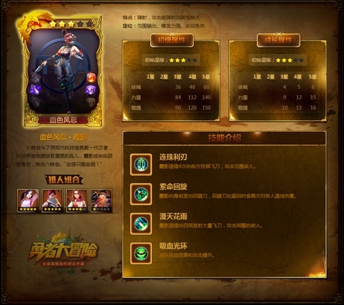 代号:血色风忍 武器:飞镖 背景:“血色风忍”霞影:八岐会为了用现代科技培养新一代忍者,从世界各地掳掠有潜质的孤儿,霞影成年后获悉身世,叛出八岐会。"血债..