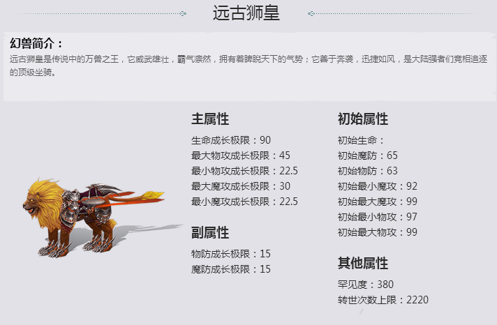 远古狮皇是双攻都很高的骑宠,生命中上。毫无疑问的帅气外形,还是绝版。