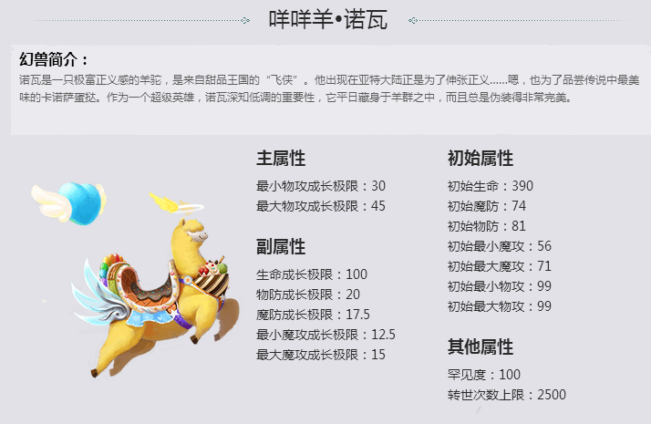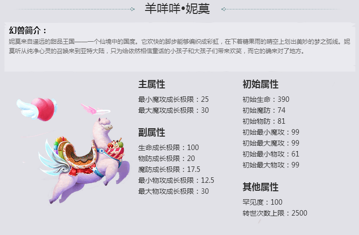 羊咩咩·妮莫 | 魔攻成长极限25~30 | 100 | 物防成长极限:20 魔防成长极限:17.5 | 低,副宠充裕,便宜 | 40星左右,容易 |