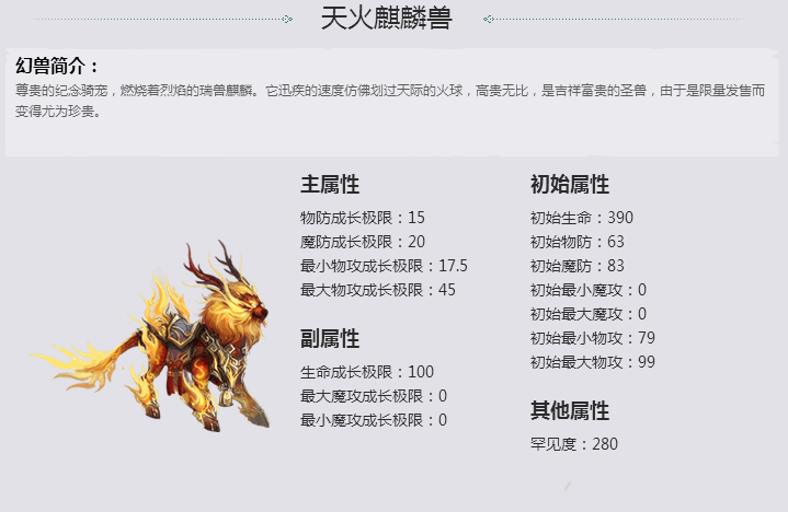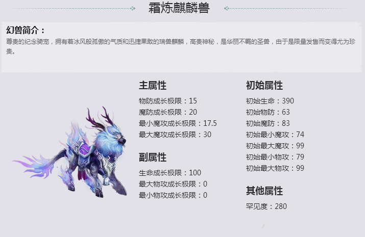 麒麟,一战一法。外形上没有硬伤,还挺酷。主属性算一般不差,以骑宠来说,生命较高。