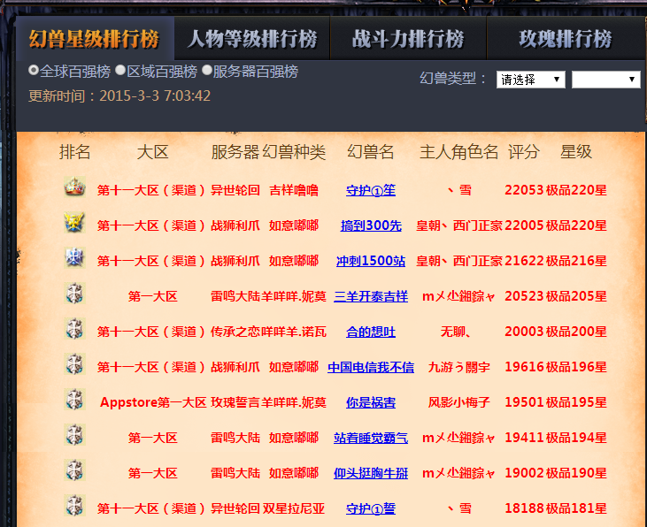 下面就让我们看看全球排行榜,分析一下现今幻兽流行走向。