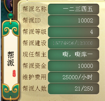 4、维护费用:帮派每小时会扣除一定的费用作为帮派维护,如果维护费不足,帮派建设度会随之下降,帮派建设度不足将会直接影响本帮派等级。